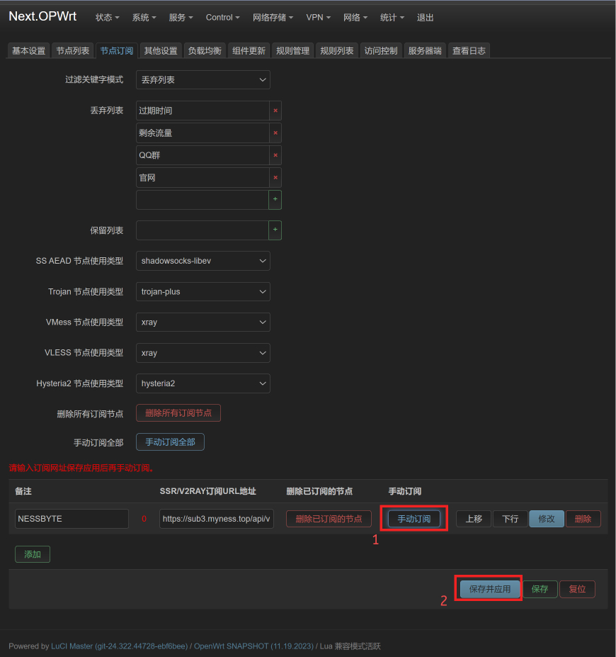此时,在节点订阅的最下方,多出一个刚刚添加的订阅,然后再点击一下手动订阅(非常重要,不然节点不会出来),此时会更新订阅,如果您的订阅地址正常无法访问,需要先手动重新添加一个节点,然后使用点击:手动订阅。最后保存&应用。如图3