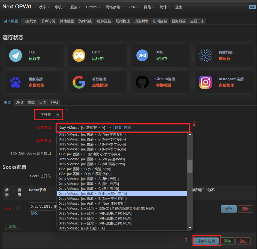 - 选择到 基本设置 tab (图5),选择 TCP节点,选择你想使用的节点,保存&应用,完成上网。
