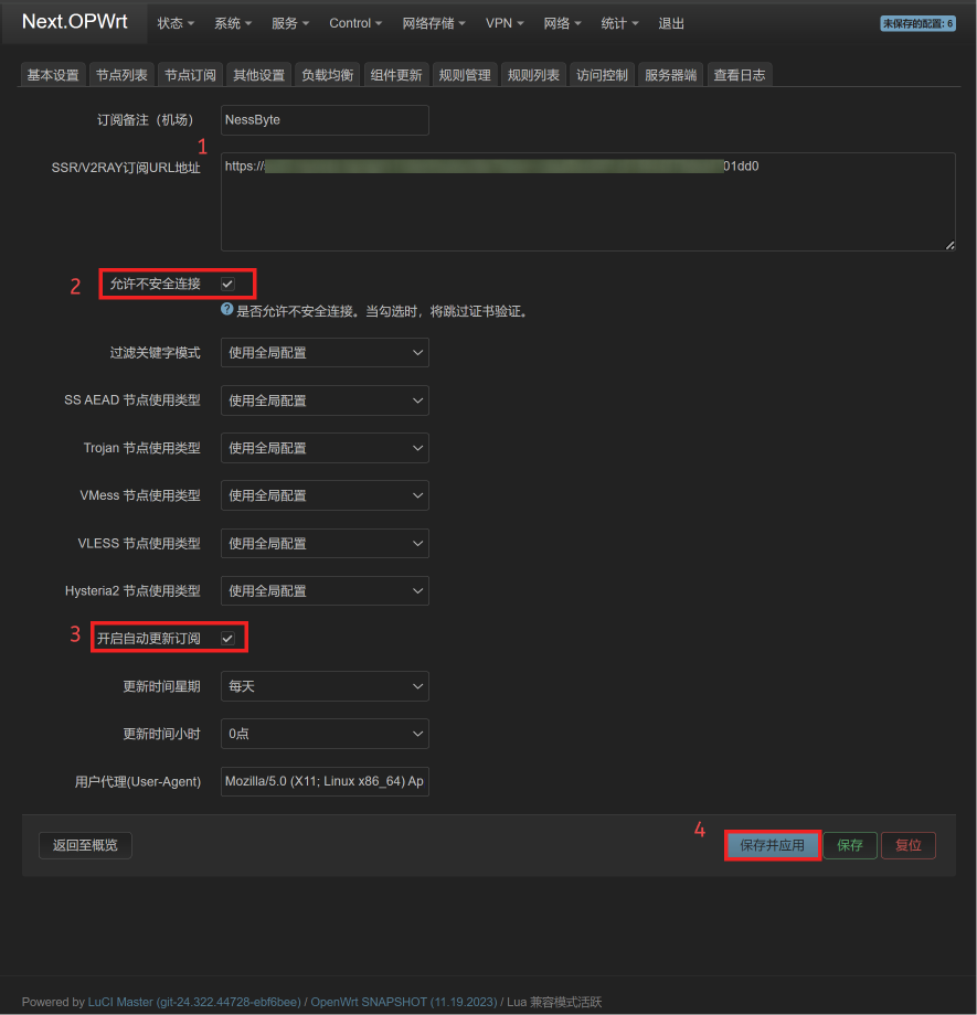 - 添加新节点页面,如图2。按图示将 名称,订阅网址,每天开启自动更新加上。然后点保存&应用。