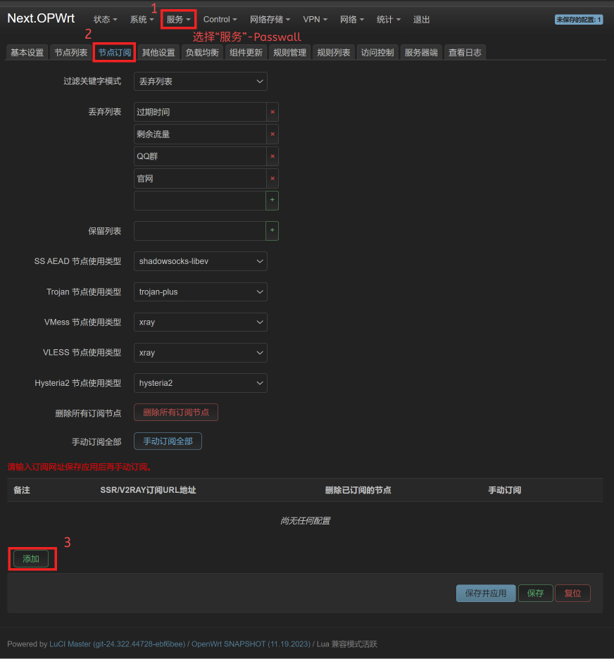 在浏览器进入Openwrt 软由路地址,在菜单选择【服务】➔【Passwall】,进入Passwall配置