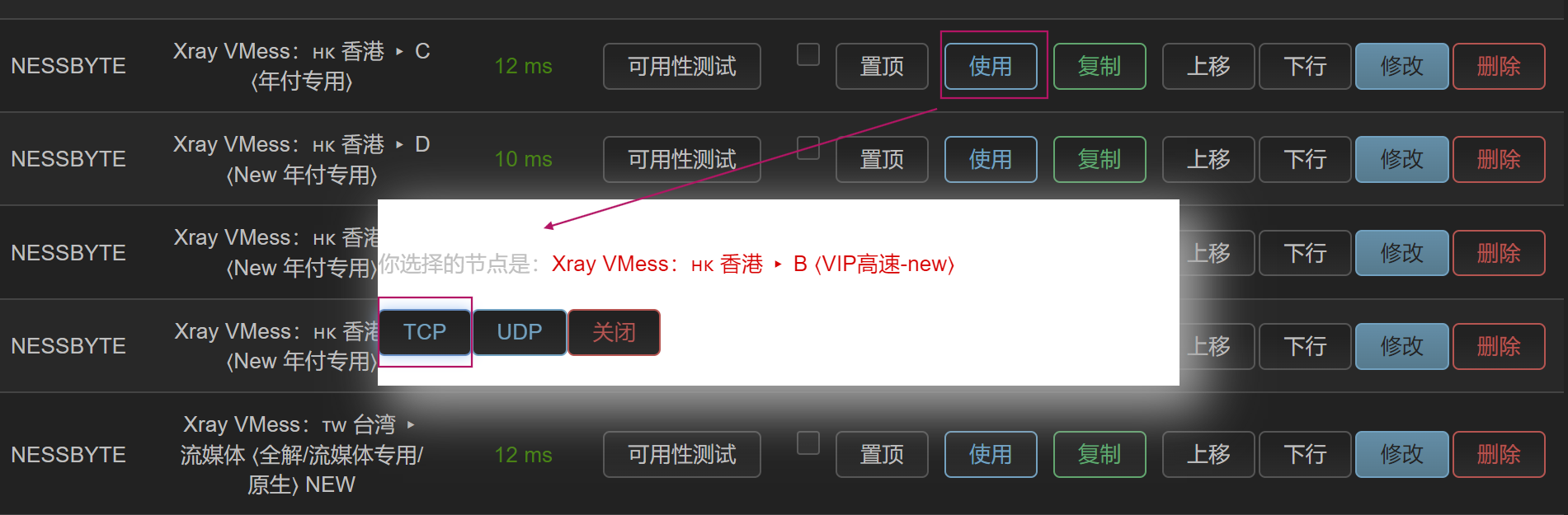 **节点列表**选项卡(图4),选择一个自己想要的节点,点击 使用,然后选择 TCP 上网,完成上网。 - 注意:一定要检查 Passwall 首页 “主开关” 是否打开。没有打开是不会生效的。
