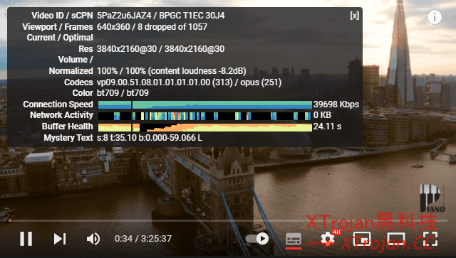 为保证测速效果,测试环境为最低配置,移动100M + 普通节点,YouTube 4K 跑分为 39698Kbps。