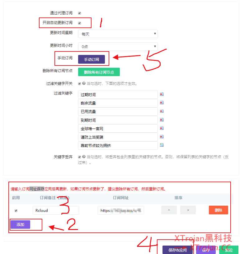 先到节点订阅内开启自动更新订阅,在最下边填写并保存订阅节点网址,再手动更新一下节点