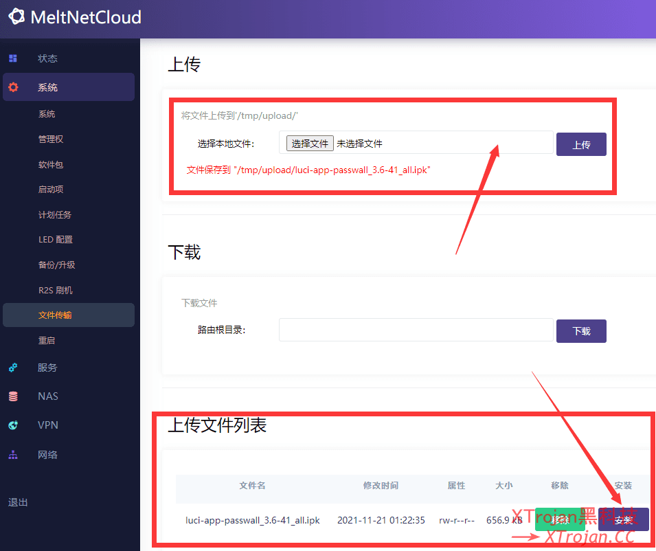 下载好 passwall 插件,打开 OpenWrt 管理界面,进入系统列表页找到文件传输,选择上传 passwall 插件,并在上传文件列表进行安装,如下图: