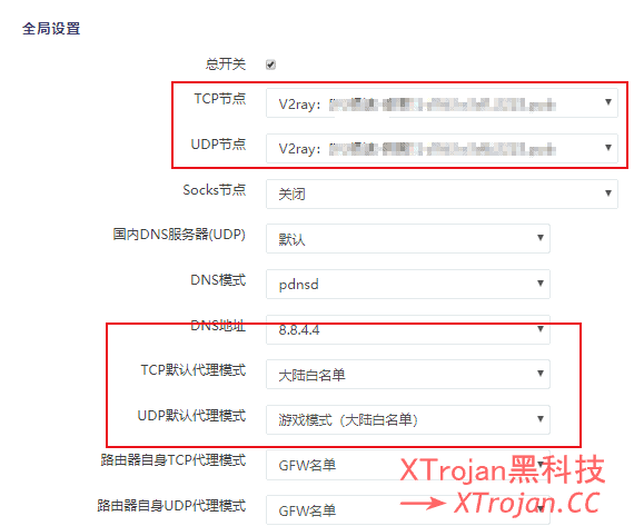 到基本设置内 -> TCP节点 -> UDP节点选择俩个不同的节点,优先选择延时最低的,TCP默认代理模式选择大陆白名单,UDP默认代理模式选择游戏模式大陆白名单,其他可以不用动,按照下图设置即可,然后打开总开关保存应用。