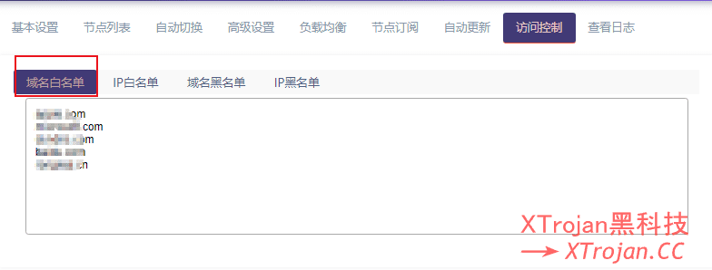 如果有些域名不想通过代理访问,可以在访问控制内添加到白名单(白名单域名不走代理通道,对所有模式有效,且优先于黑名单。)