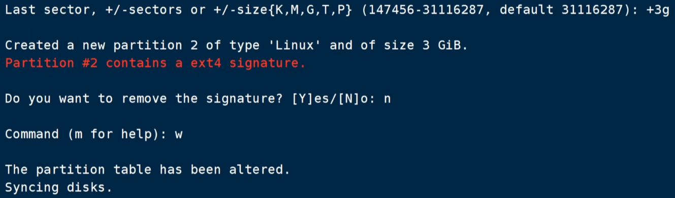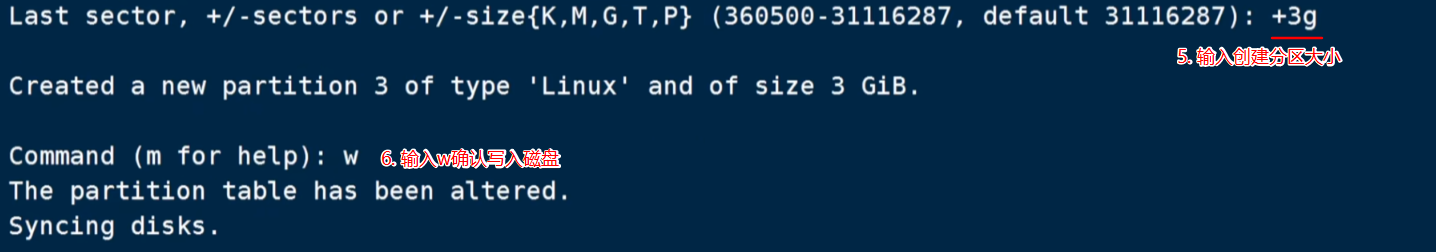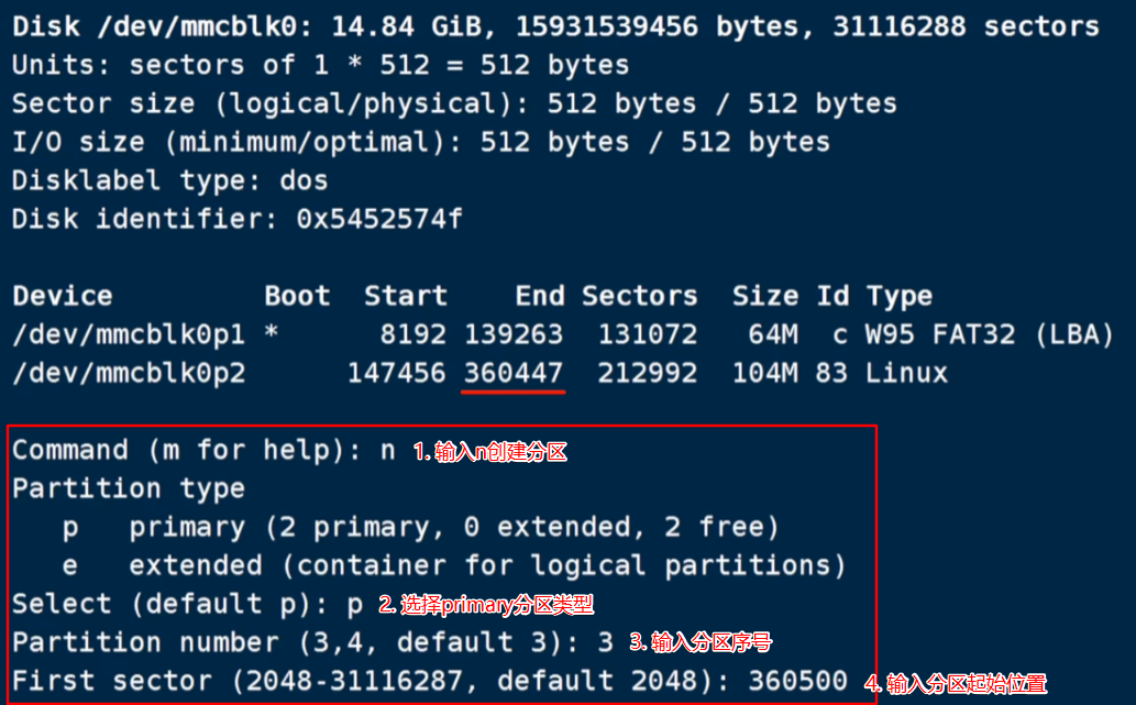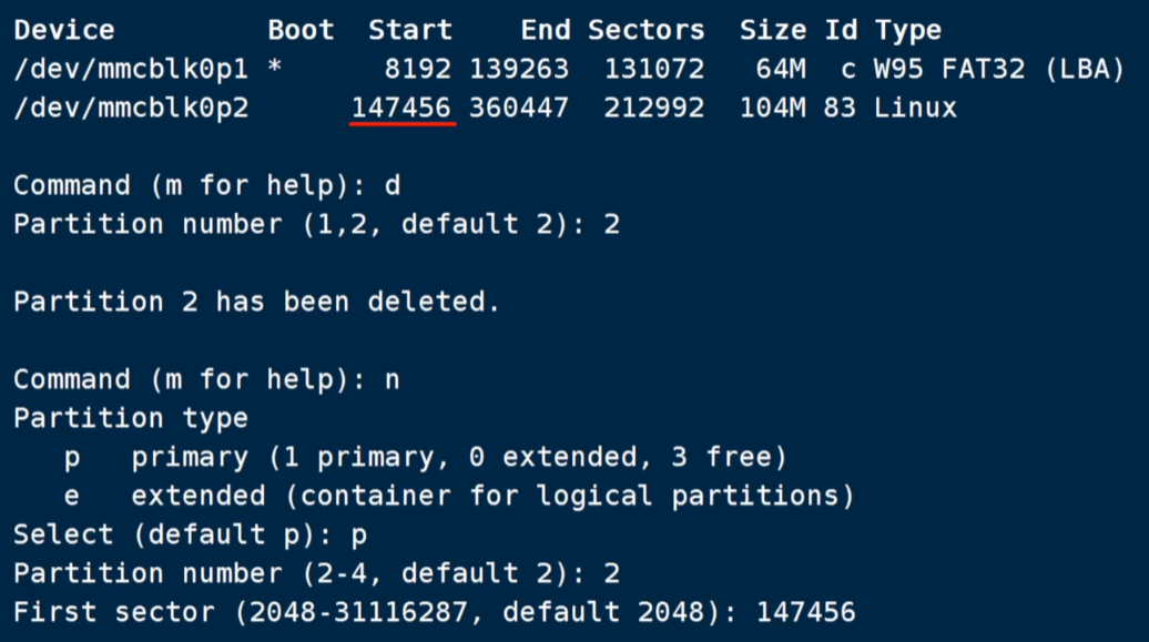 - 删除旧分区(需要记住旧分区的磁盘起始位置(扇区编号),如图下划线位置),并创建新分区