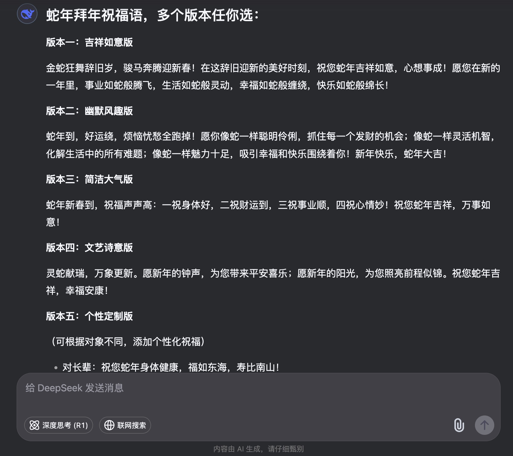 举个例子,如果你想让 DeepSeek 帮你写一段蛇年拜年祝福语,直接告诉它这个需求,它就能立刻生成多个风格的版本。