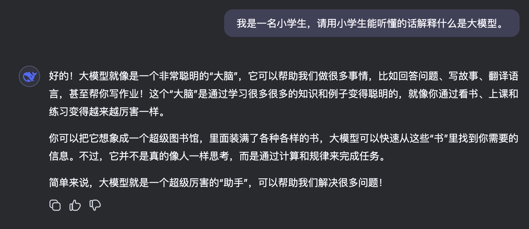 可以给它一个提示:“我是一名小学生,请用小学生能听懂的话解释什么是大模型。”