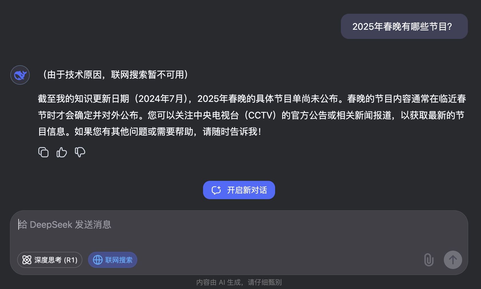 例如,你问DeepSeek:“2025年春晚有哪些节目?”它可以在网络上找到最相关的资料,并结合大语言模型的能力生成确的回答。