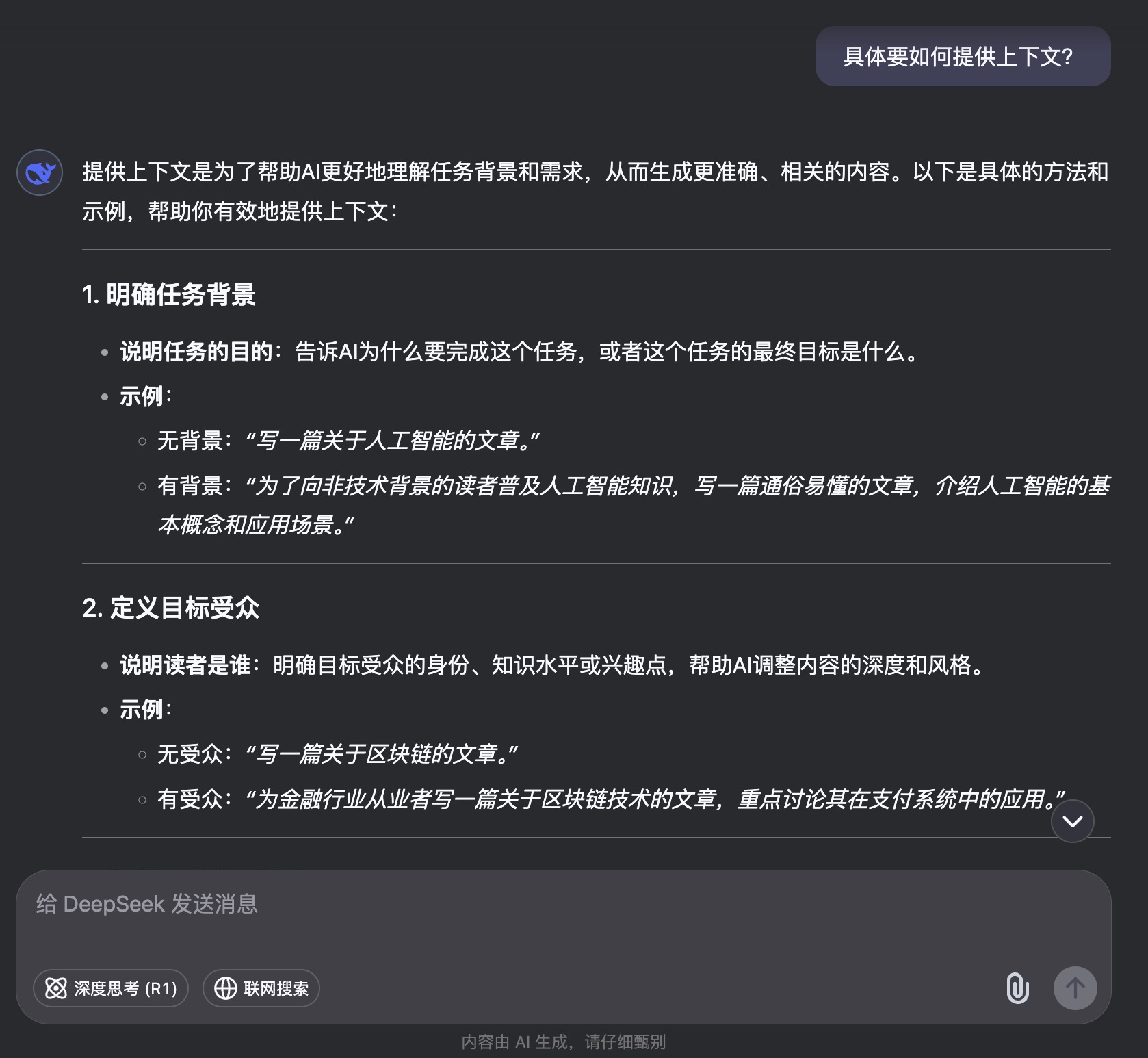 对于如何提供上下文,我还是不明白,我可以继续追问DeepSeek。