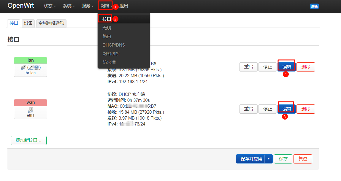 1、把wan、lan都编辑一遍,如果有wan ipv6接口,可以选择直接删除