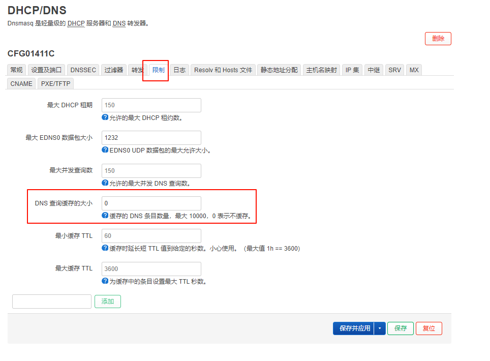最后,在“限制”中把DNS缓存去掉,配置为“0”