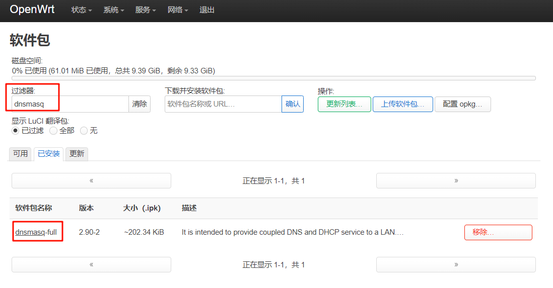 1、在过滤器中搜索:luci-i18n-base-zh-cn,安装后改成中文界面,刷新页面后显示中文。
